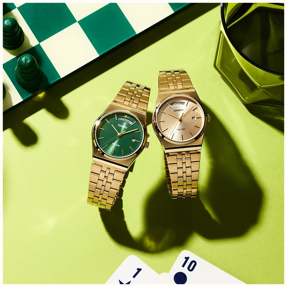 Casio Retro MTP Series Day/Date (35mm) Green Sunray Dial / Gold PVD Stainless Steel Bracelet