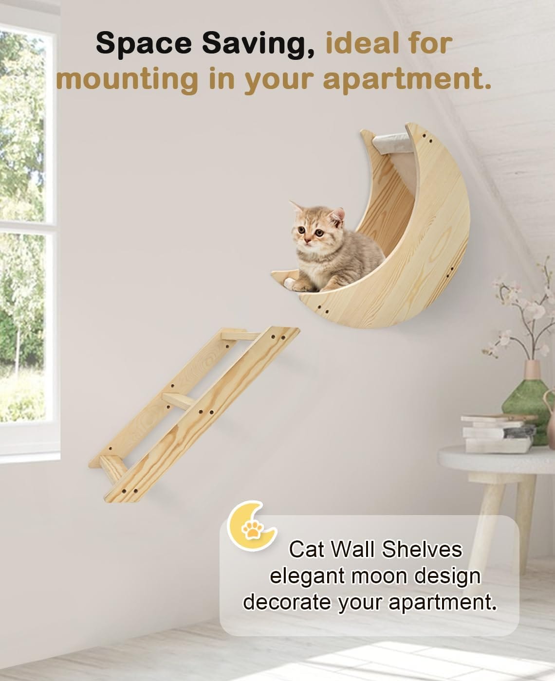 Cat Wall Shelves with Step , Cat Shelves for Wall with Step, Wall Mounted Cat Furniture, Cat Wall Furniture for Climbing, Sleeping and Playing, Cat Wall Steps for Indoor Cats or Kitty Cat Shelves Moon