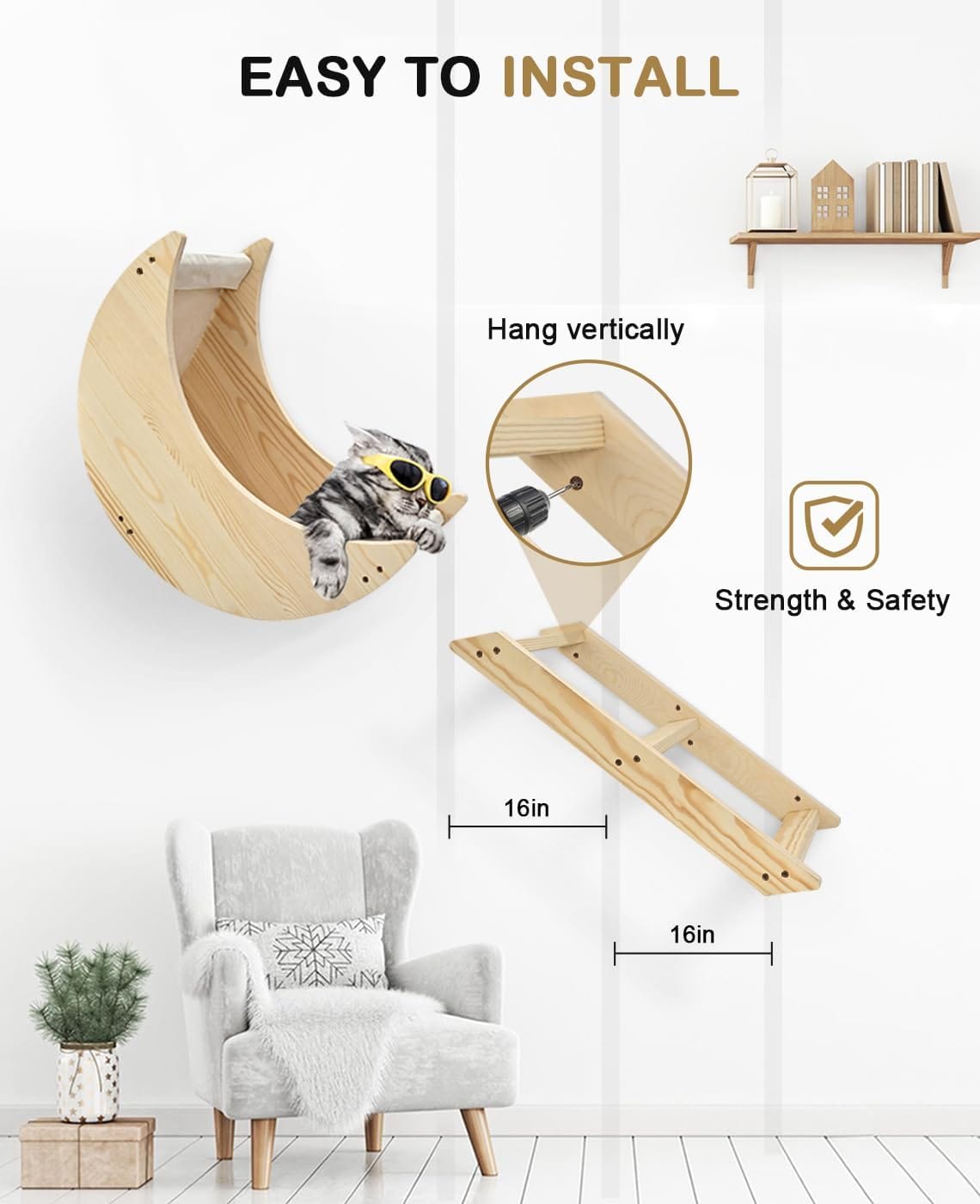 About Cat Wall Shelves with Step, Wall Mounted Cat Furniture for Climbing, Sleeping and Playing, Wall Moon Bed for Indoor Kitty