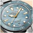 The blue mother-of-pearl dial is encased by an anti-reflective sapphire crystal.