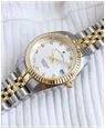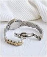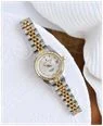 Model Specifications NRO.08: This model showcases a gold and silver colour scheme. The watch's stainless steel case measures 26mm in diameter. Adorning the silver sunray dial are eleven crystal-set indices. A magnified date display replaces the 3 o'clock hour marker. There are also gold-tone hour, minute and second hands which feature a luminescent inlay. Framing the dial is a gold-tone fluted bezel. Securing the watch to the wrist is a two-tone gold and stainless steel bracelet that fastens with a deployment clasp. This model is also water resistant up to 50 metres (5 bars).