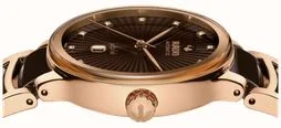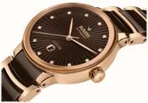 • The Centrix model’s case and bracelet made of a mix of rose gold PVD-coated stainless steel and the signature Rado high-tech ceramic. The case and bracelet are an earthy brown colour with rose gold details.